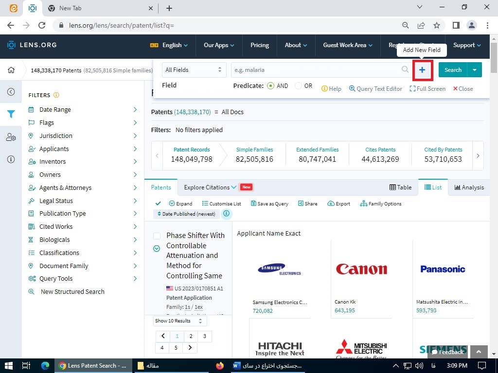 - پس از آن که واژه مورد نظر خود را با فلیتر های انتخابی وارد کردید و کلید Enter را فشردید ، پتنت های مرتبط برای شما مانند صفحه زیر لیست می شود.